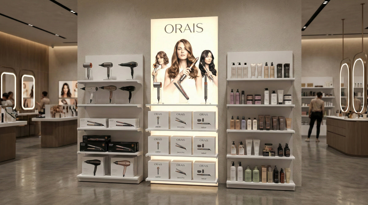 A lightbox that actually holds stock. Our patented profile features integrated slots every 32mm, allowing you to mount heavy-duty shelves directly onto the illuminated frame.